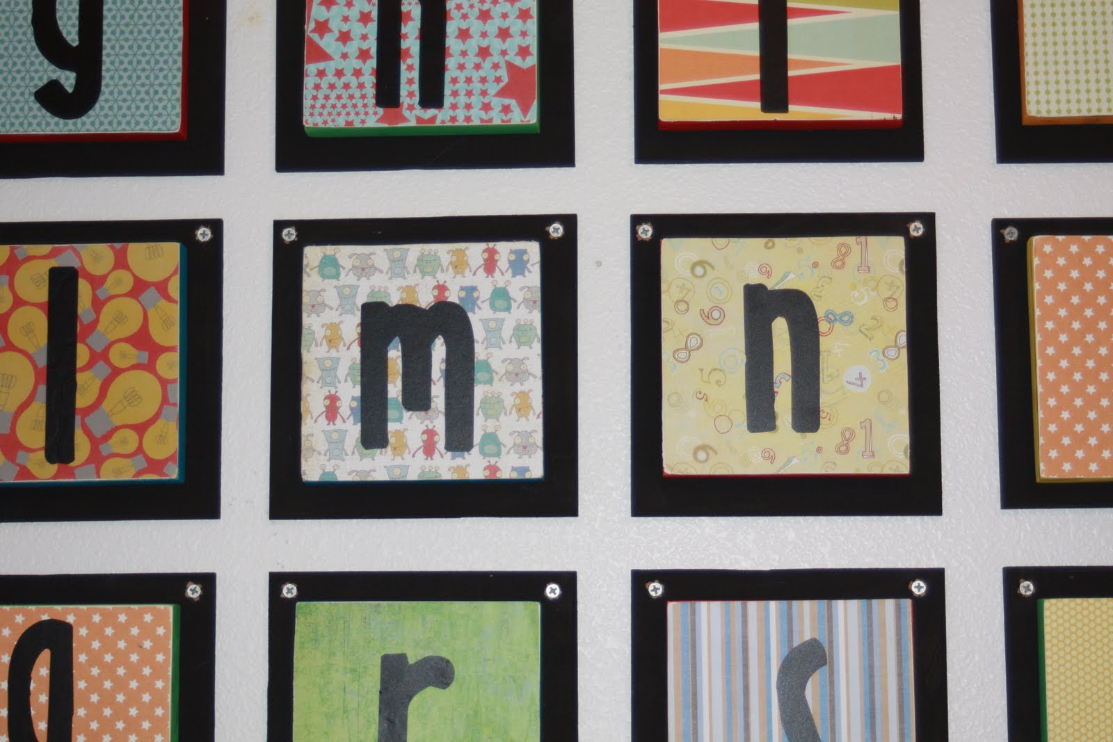 Dax loves counting and his ABC's. Even though he can't really sing or say the ABC's, and just knows a couple of the letters, which is still great. I saw this idea on How Does She, I found it here. I have been trying to decorate the boys' room in robot, since it is little boy like, bright bold colors, and hopefully will last awhile and wont grow out of it. I can always switch the robot stuff with cars,airplanes, monsters, super hero's, whatever they are into in a couple of years. I made my abc's a little different. I just screwed them into the wall, because I am no measurer ( if that is a word-apparently not, it has a squiggly red line under it!) The screws added to the robot feel. I could paint the screws black, but I actually like them. I started hanging these up one night myself. I got the A and the B up, but Cole could here me yelling. I get putting tiny holes in the wall. Dax then picked up "Gosh Dang it!" or "Dang it!". The Cole came in to rescue me, and finish hanging them up. Thanks hun! The boys' room is coming along very slowly, but getting there. I am getting excited about how it is looking, and so is Dax. He can now look at the "E HE A's" now anytime he wants. (usually when he is going to bed, we can hear him singing "E HE A's, E HE A's"